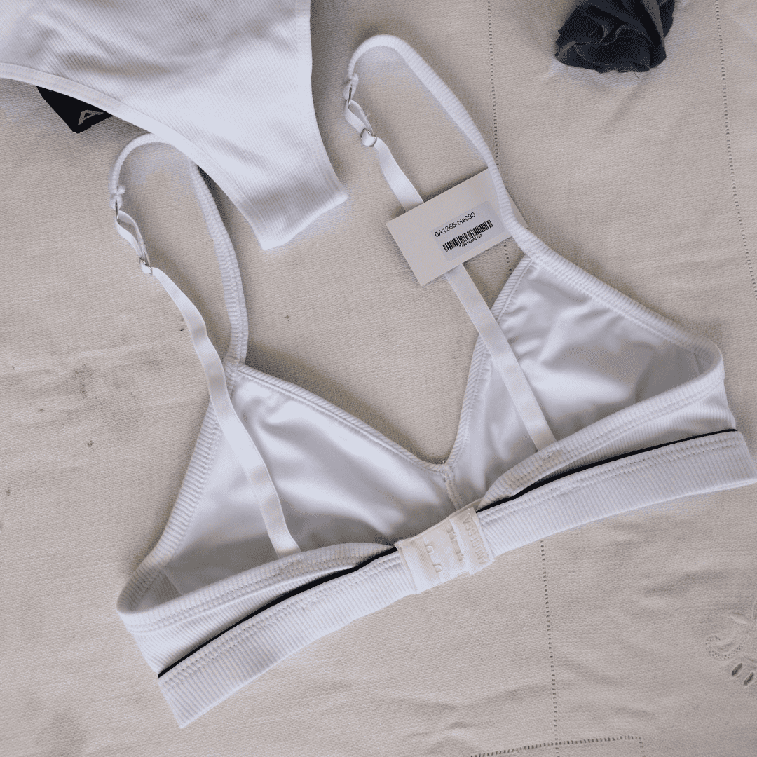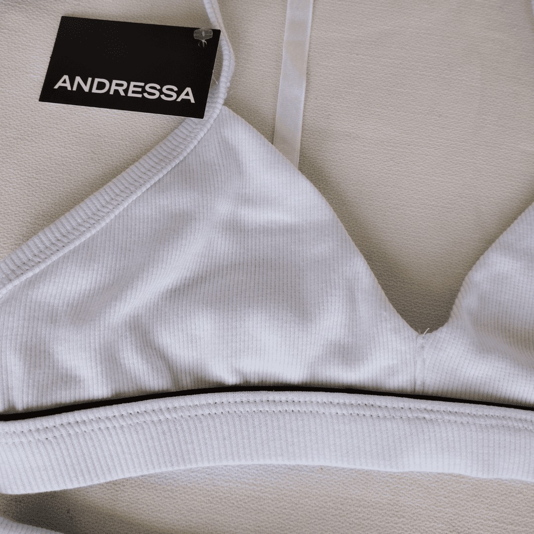 Corpiño triángulo sin relleno con forro interno y abertura para agregarle tasa soft desmontables (no vienen incluídas) Breteles con recortes en contratono.