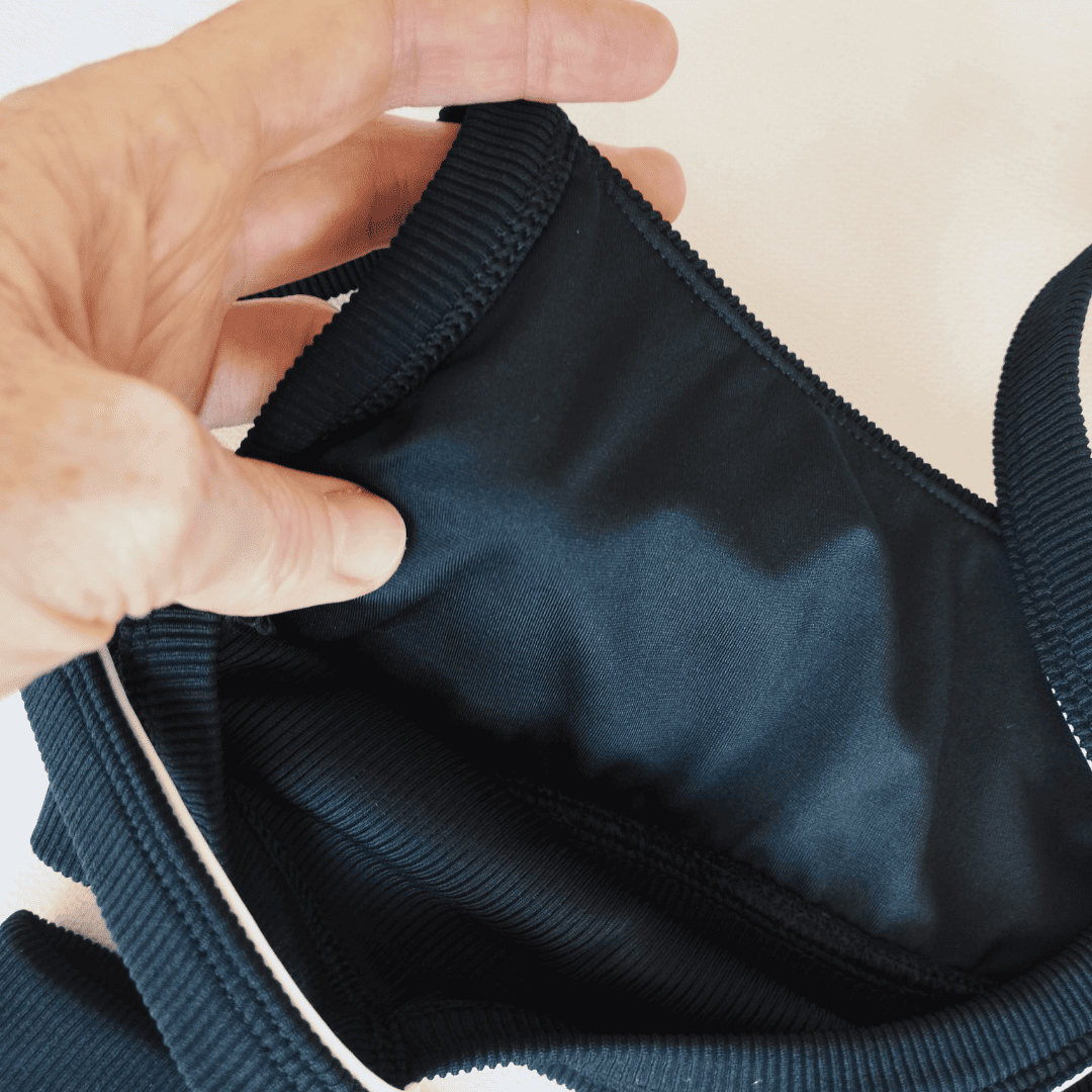 Corpiño tipo top con forro interno y abertura para agregarle tasa soft desmontables (no vienen incluídas) Breteles con recortes en contratono.