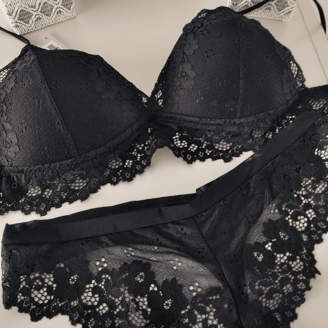 ❣Conjunto triángulo soft con base y finos breteles rulotes regulables. Culotless de puntilla con cintura de tul de lycra, super cómoda que no aprieta.