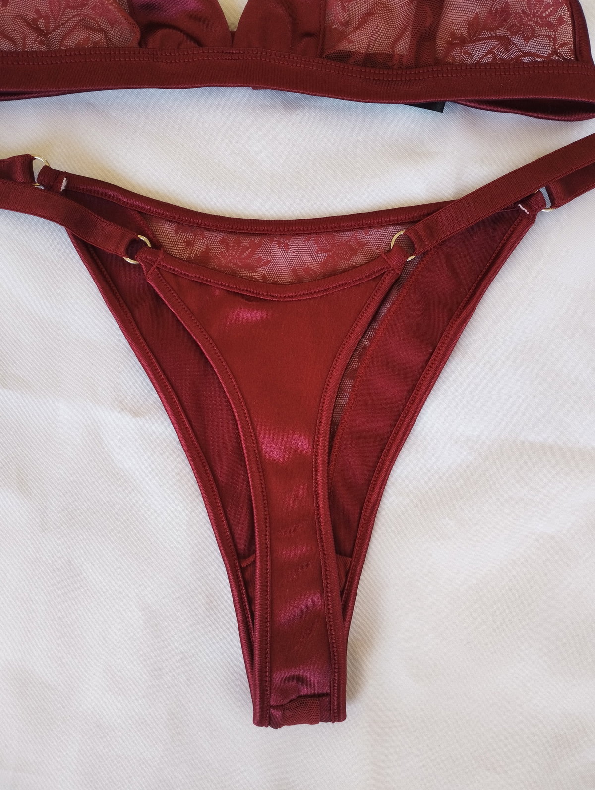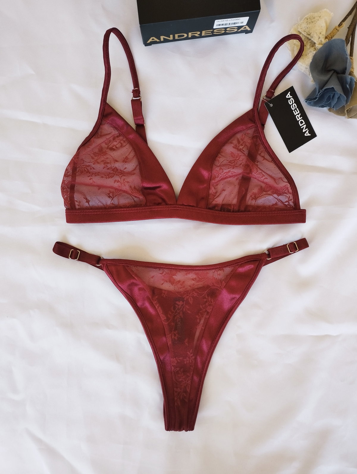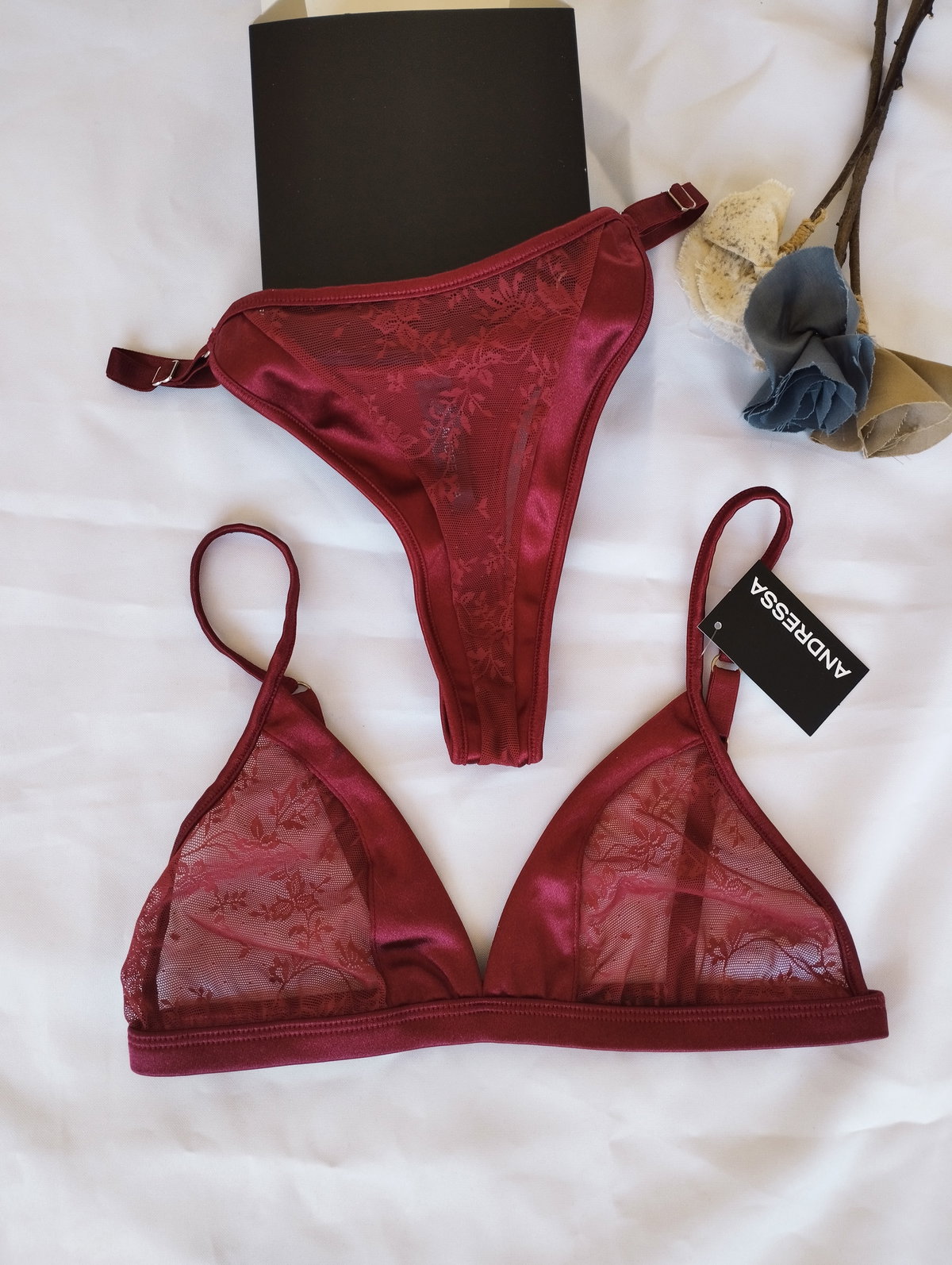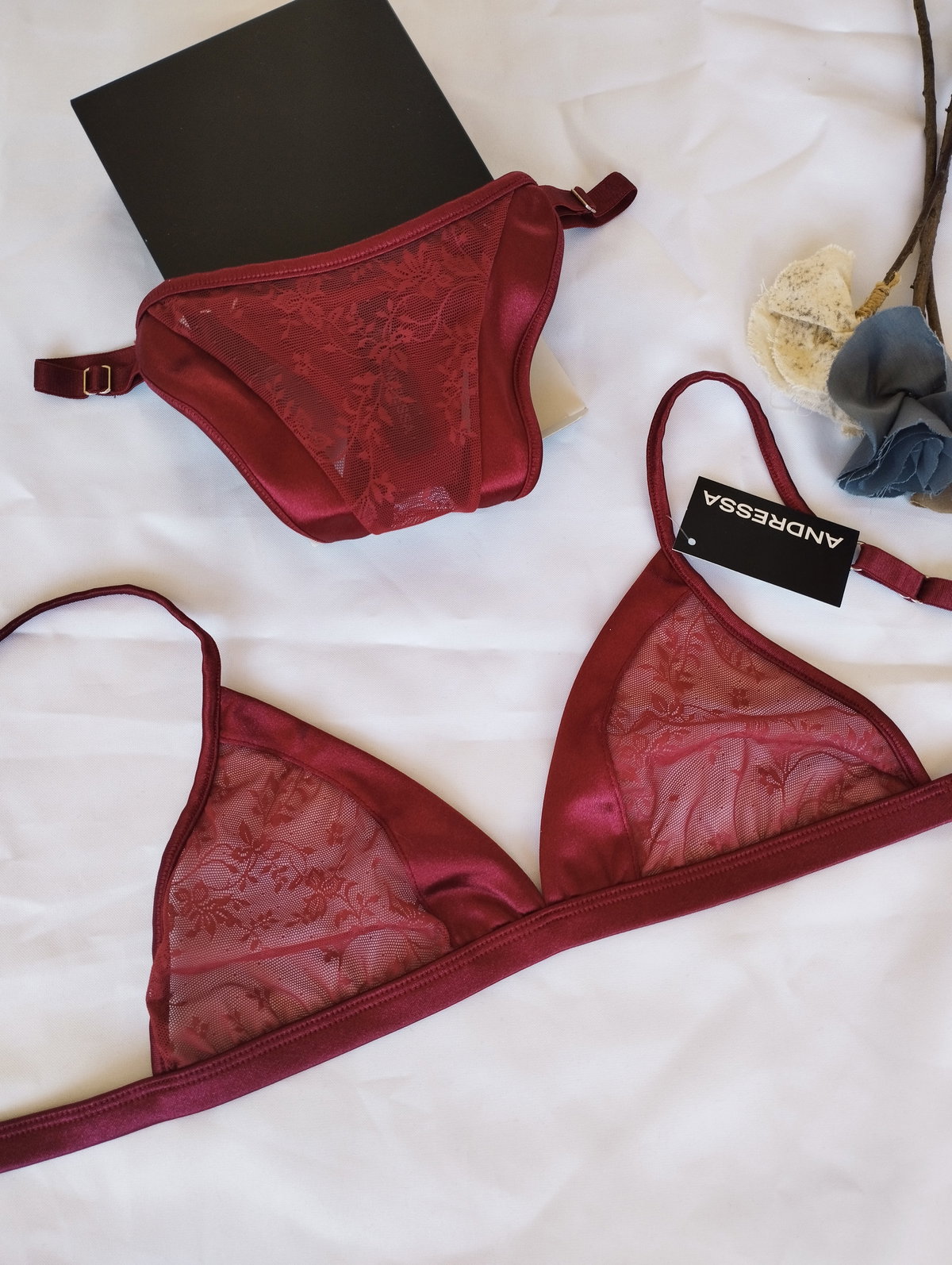 Corpiño triángulo sin relleno de encaje con recortes de raso elastizado.