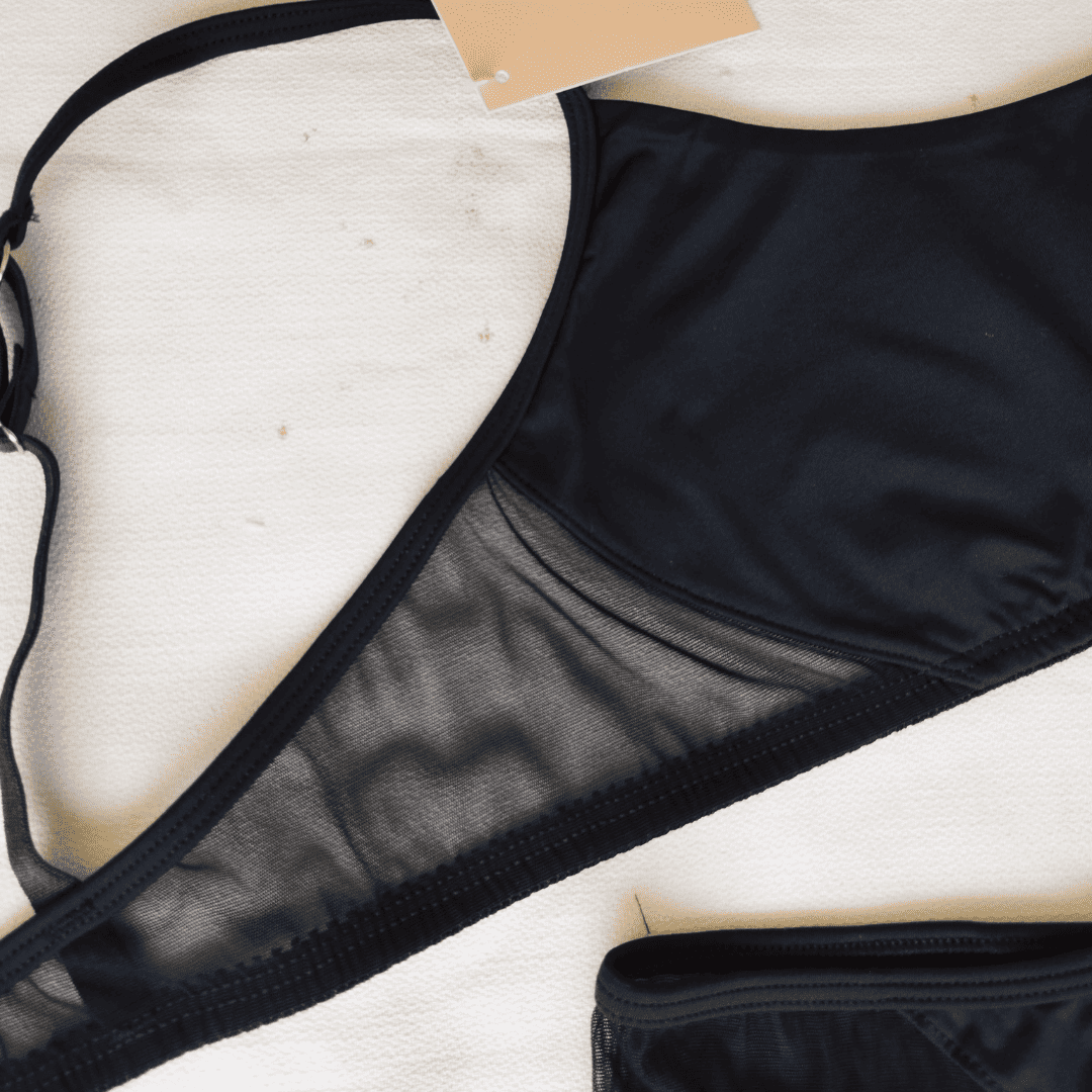 ❣ Corpiño tipo top con broche en la espalda de microfibra de nylon con recortes en tul con lycra