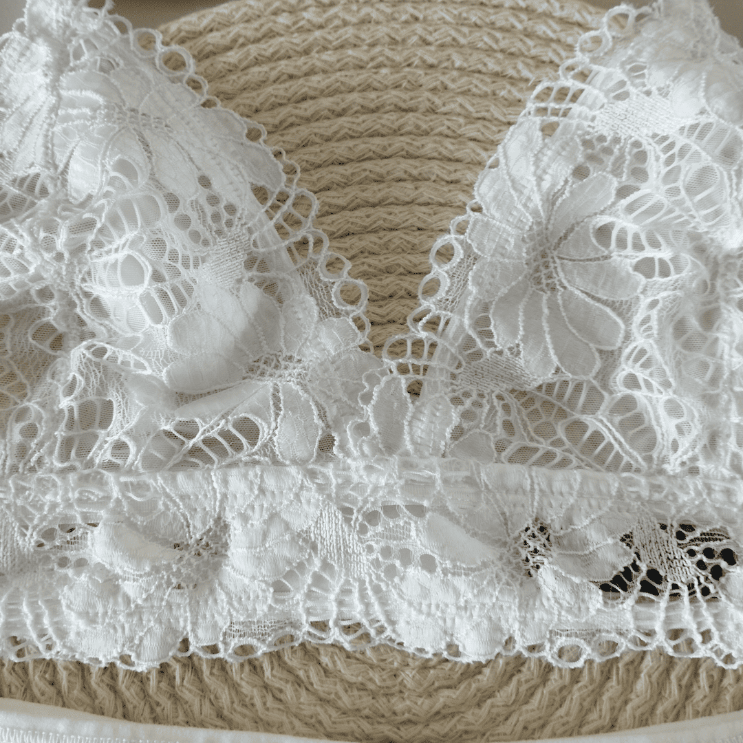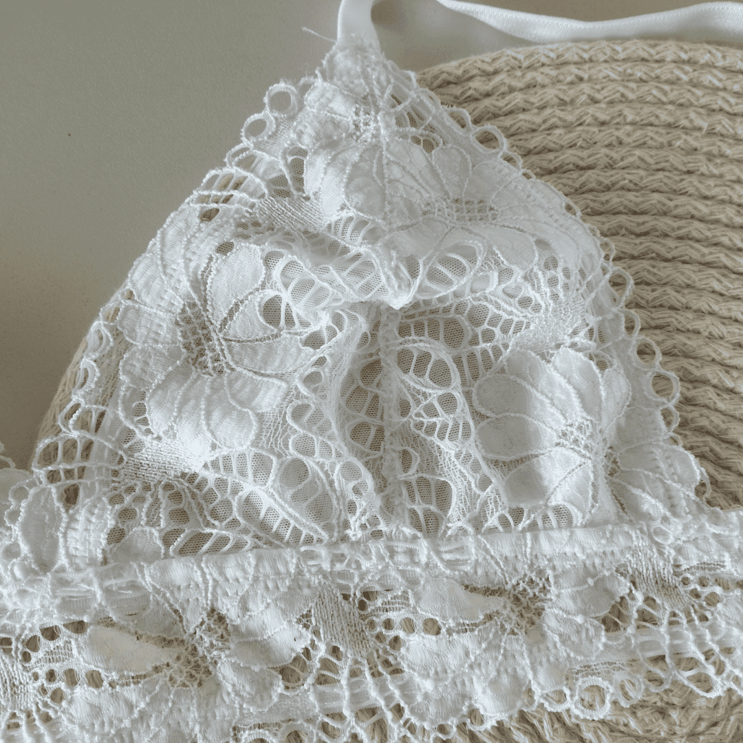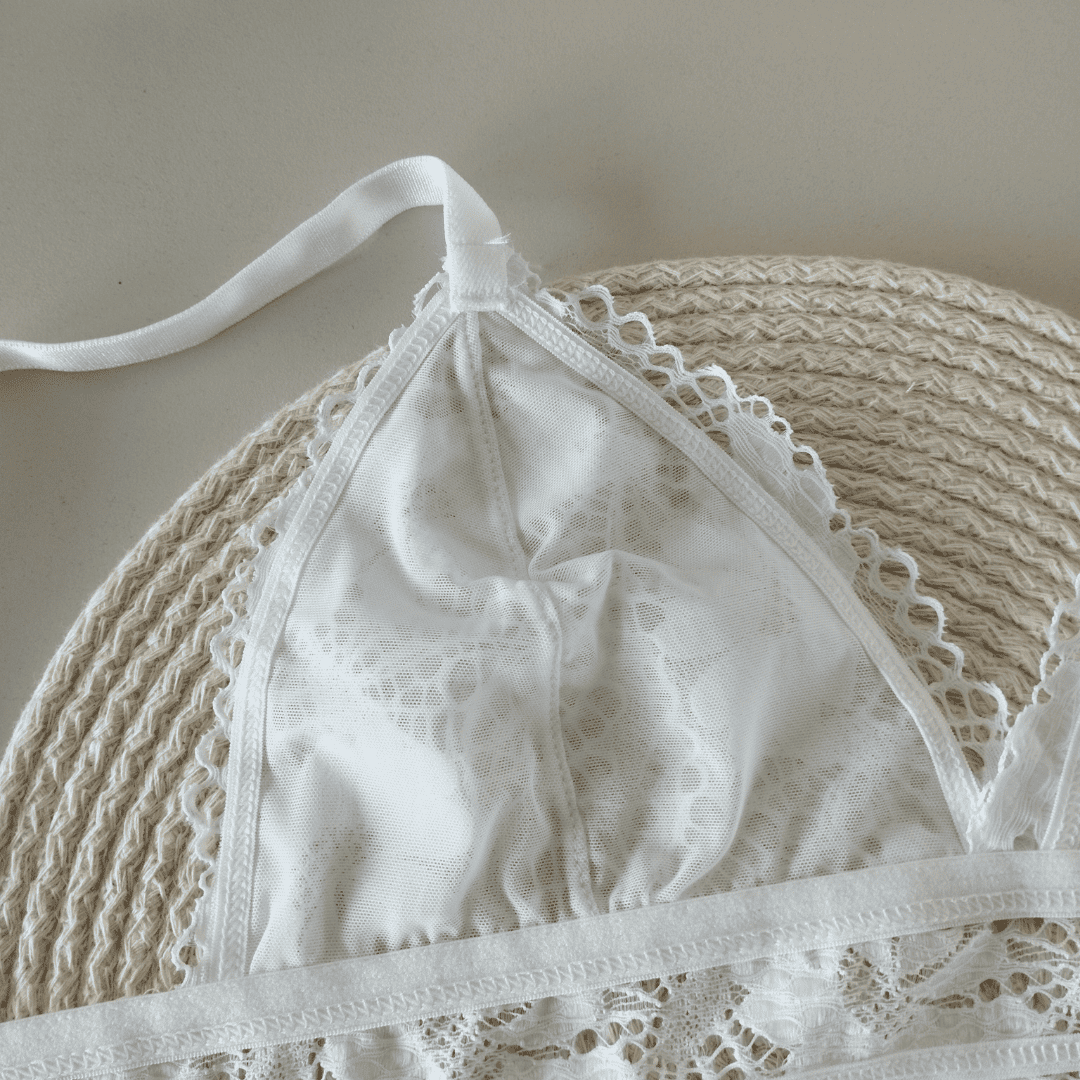 ❣Conjunto triángulo sin relleno de puntilla con tazas forradas de tul y cintura de puntilla.