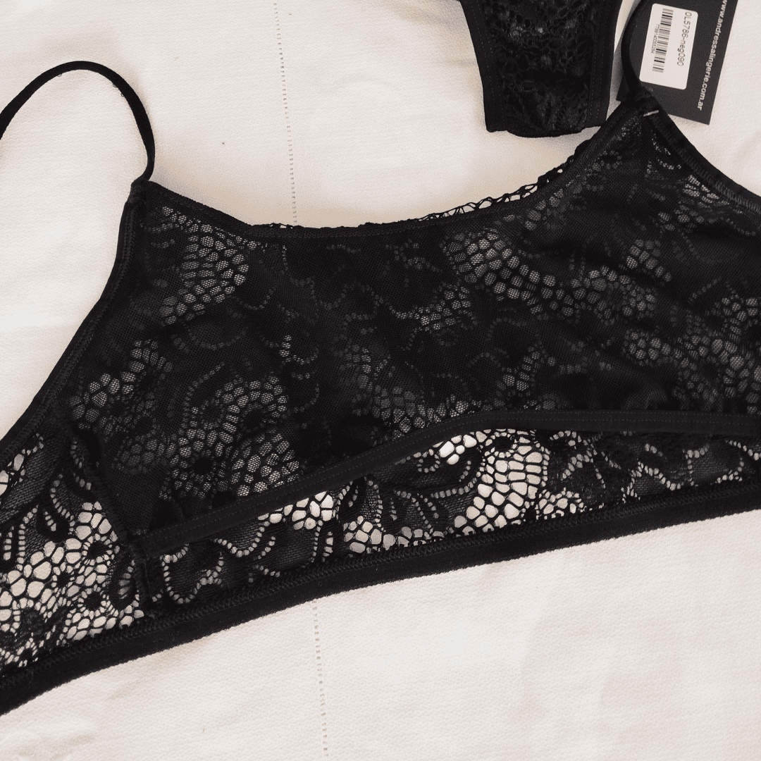 Corpiño sin aro ni relleno con broche en la espalda, forrado en tul con elástico en el bajo busto para mayor sostén.