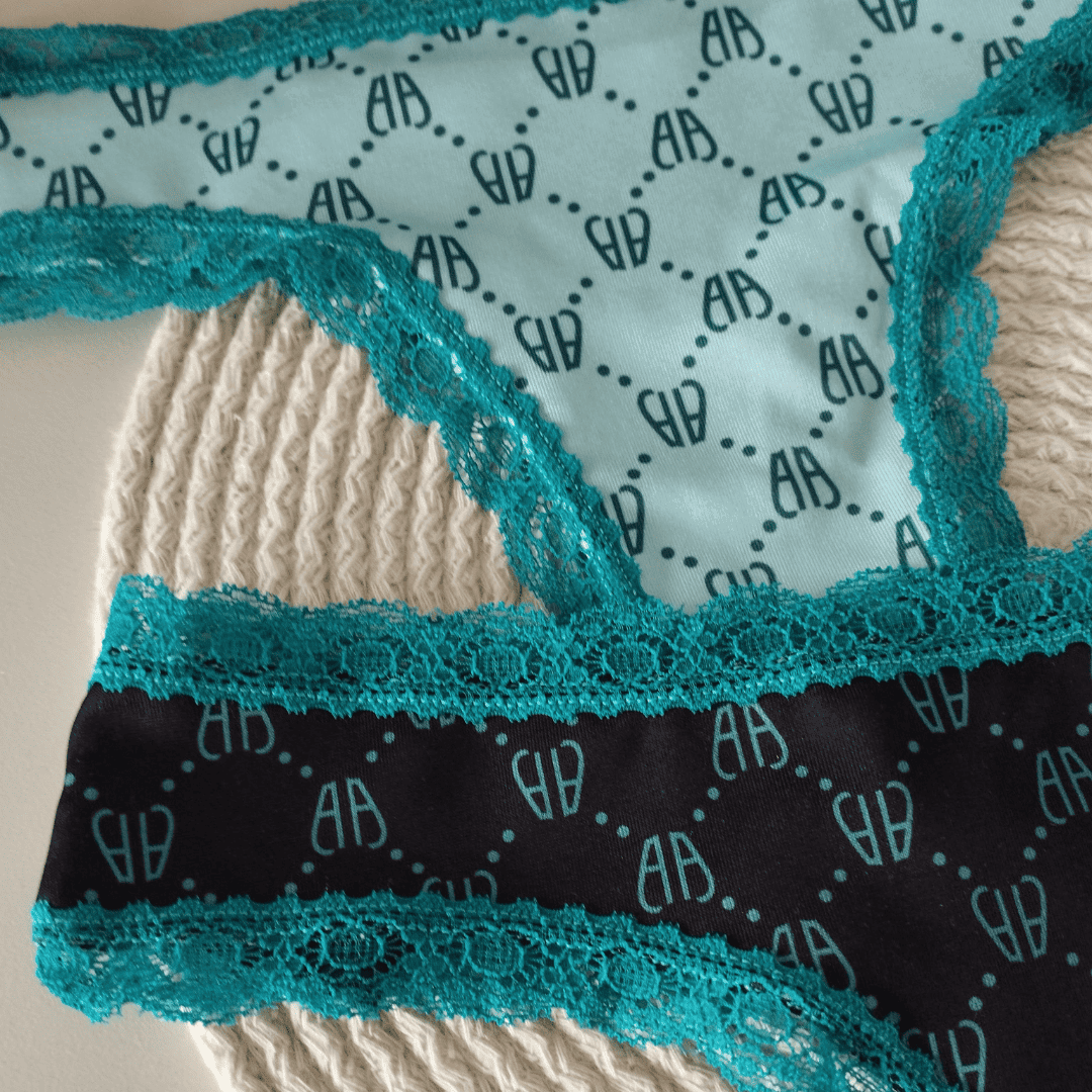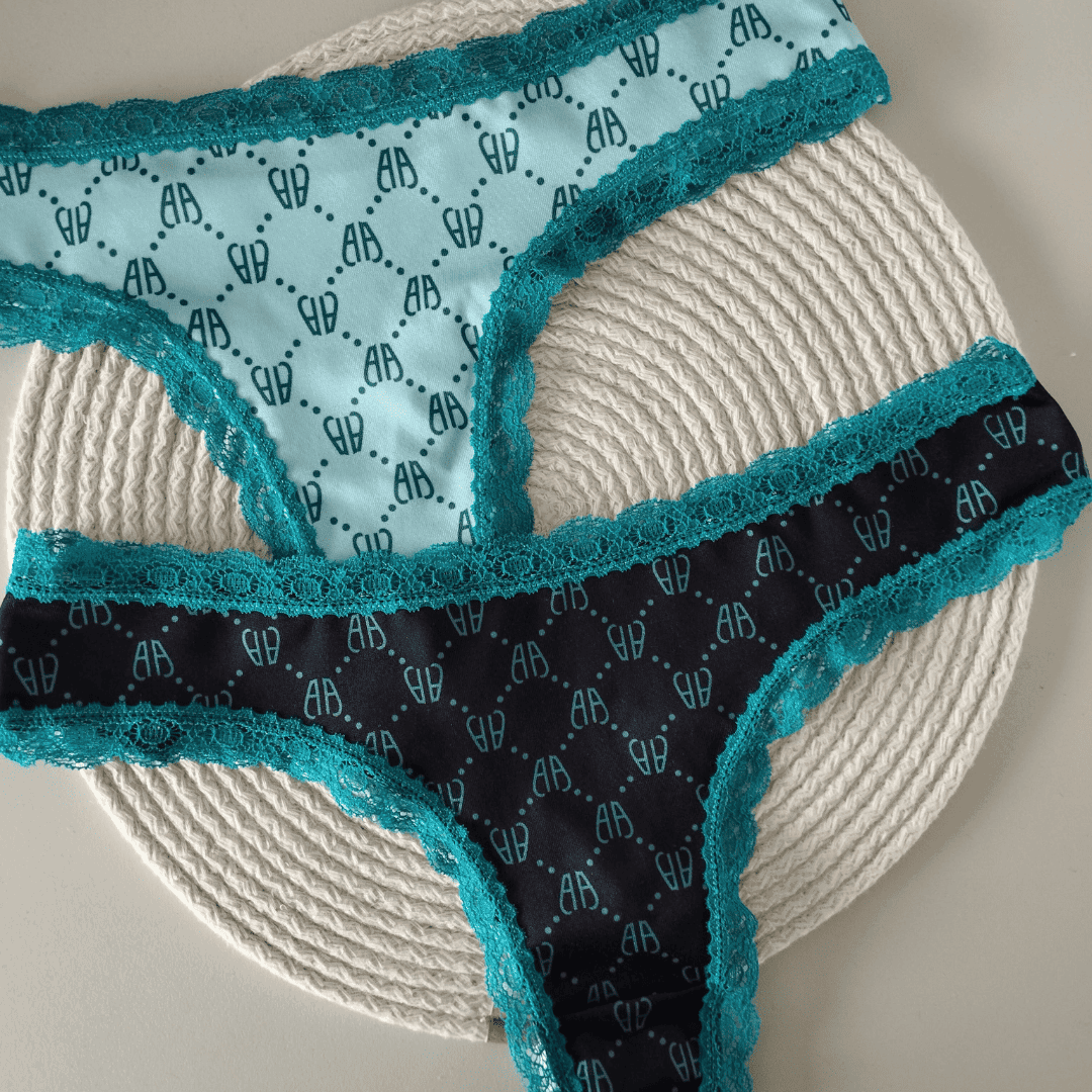 Pack x2 less de microfibra estampada logo Andressa con puntilla color petróleo. ¡Súper suaves, ceden y no ajustan!