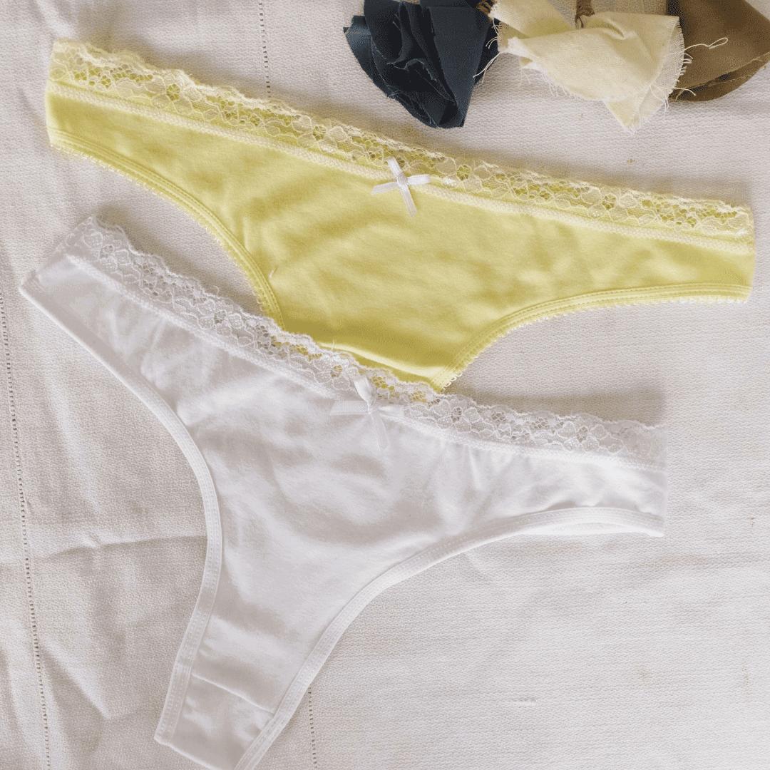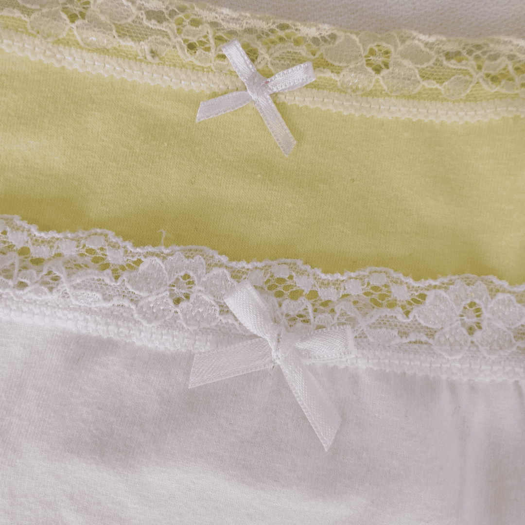 Pack x2 less de algodón y lycra con terminación en fina puntilla: una less color blanco y otra color amarillo claro.